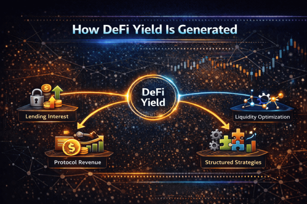 | Lending-Based DeFi Yield | 2%–6% | Lending interest | Interest rate volatility, smart contract risk |