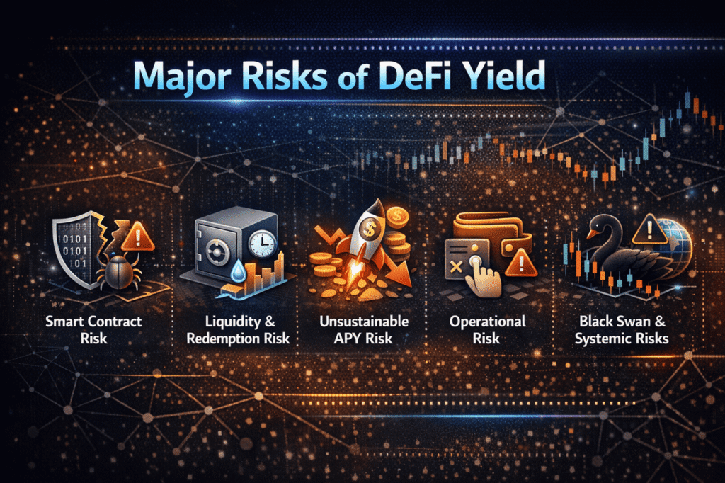 Unlike traditional financial products, DeFi yield risks are not concentrated in a single area. Instead, they span smart contract security, liquidity and redemption mechanisms, yield sustainability, and user operational behavior.