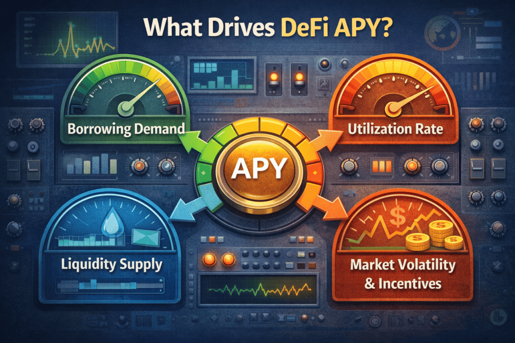 APY (Annual Percentage Yield) represents the annualized return calculated on a compound basis. In DeFi, APY is not a fixed number set by a platform. Instead, it is dynamically determined by on-chain supply-demand conditions and protocol rules, which explains why DeFi APY can change rapidly.