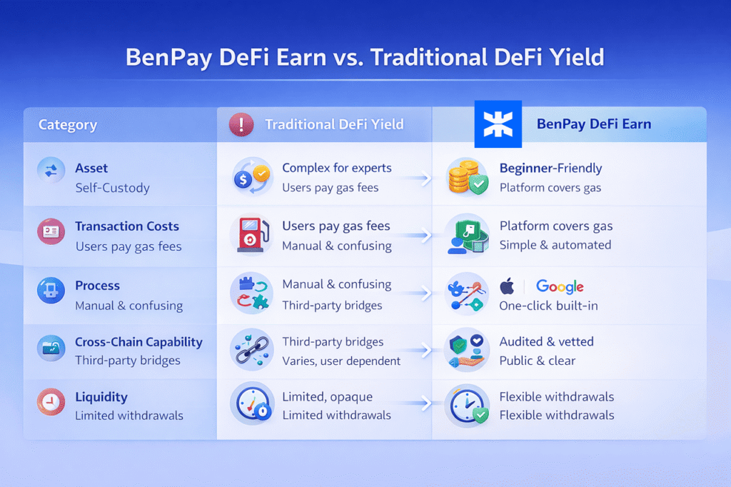 | Category | Traditional DeFi Yield | BenPay DeFi Earn |