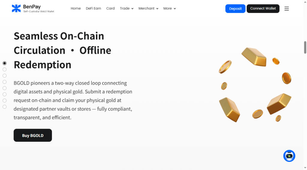 BGOLD is a gold RWA token issued on the BenFen blockchain, a Move-language Layer 1 designed for payment and real-world asset applications. It is available through BenPay, a one-stop on-chain financial platform that also offers a self-custodial Web3 payment card, multi-chain wallet, DeFi Earn, and cross-chain bridge.