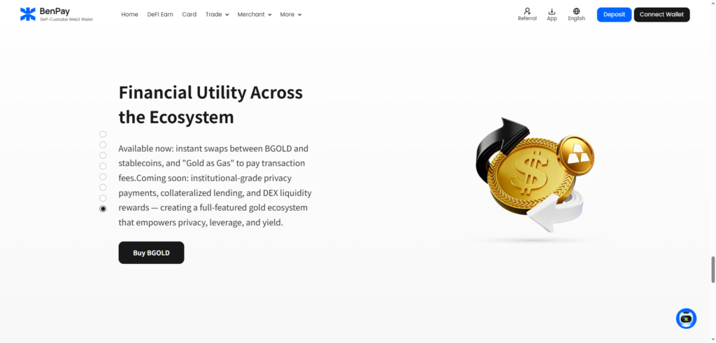 BGOLD is not just a passive store of value within the BenPay ecosystem. Currently live features include instant swap between BGOLD and stablecoins (BUSD/USDT) and the ability to use BGOLD directly as gas payment on BenFen. Planned additions — with no confirmed timeline announced — include collateral for lending protocols, DEX liquidity provision, and privacy payment. Check the BenPay RWA help center for the latest feature availability.