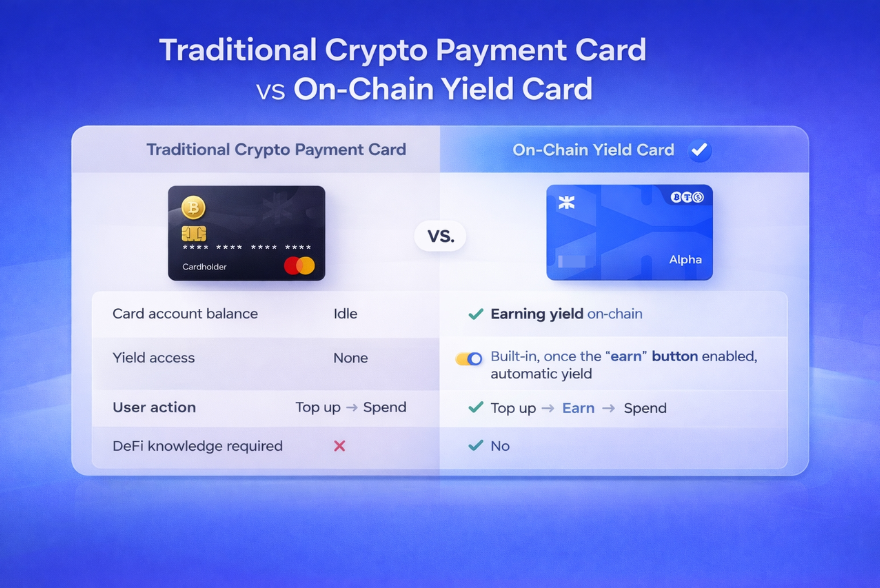Unlike traditional crypto cards, where balances sit idle until spent, an on-chain yield card ensures that unused funds continue to work and generate on-chain yield in the background.