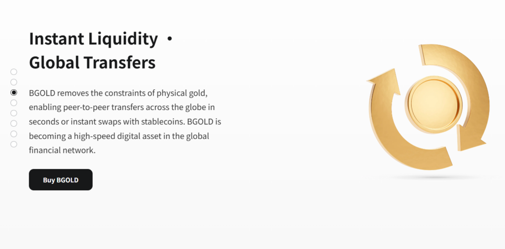 1:1 asset anchoring logic. The system enforces that tokens can only be minted after the corresponding physical asset has been deposited and verified. For gold, this means investment-grade bars meeting LBMA (London Bullion Market Association) standards must be in custody before any BGOLD is created. The same logic is designed to apply to other asset types.
