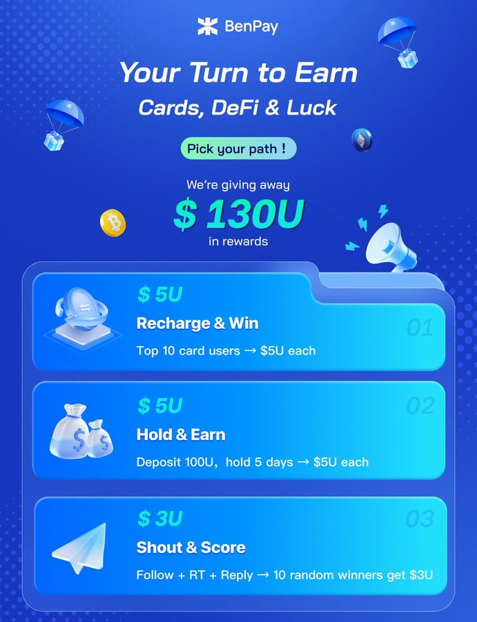 2. DeFi Earn Challenge The first 10 users who deposit 100U+ into BenPay DeFi Earn and hold for 5 days will receive $5U each.