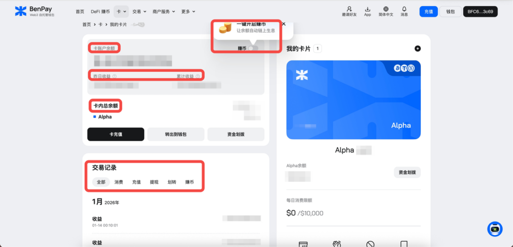 以 BenPay Card 为例,用户只需在确认风险后开启赚币功能,系统会通过智能合约完成后续操作,收益与资金状态可在链上查看,新手无需频繁手动管理。